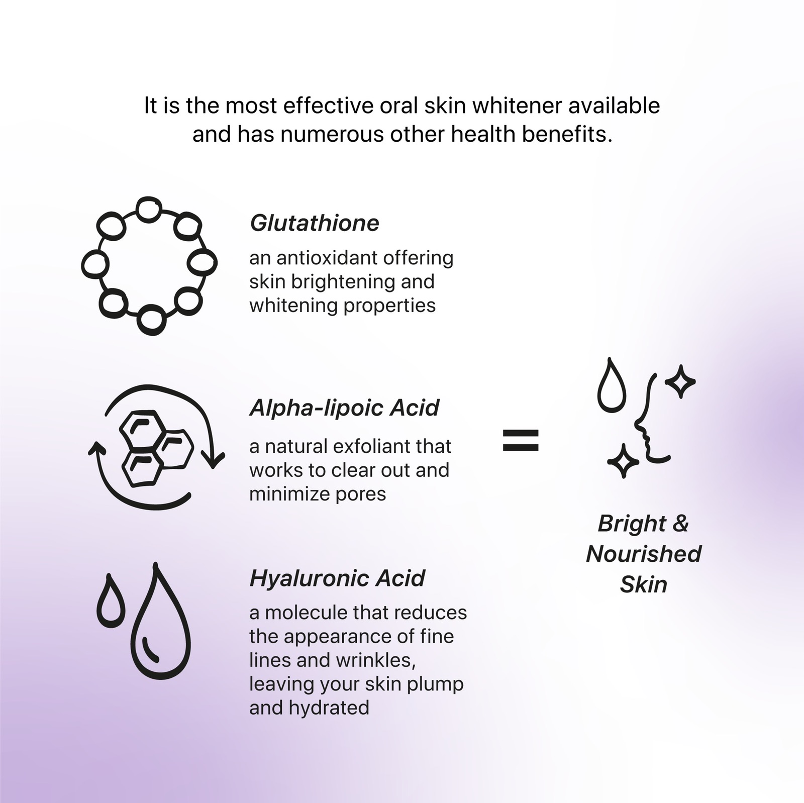 Proprietary Whitening Blend (1622mg) consisting of L-Glutathione, Green Tea 4:1 Extract, L-Methionine, Rose Hips, N-Acetyl-L-Cysteine, Alpha Lipoic Acid, Milk Thistle Seed 4:1 Extract, Citrus Bioflavonoid Complex (from Orange, Lemon, and Grapefruit Peel), Bitter Orange Fruit Extract (40% Hesperidin), Sophora Japonica Bud Extract (95% Quercetin Dihydrate), Soy Bean Extract (40% Isoflavones)